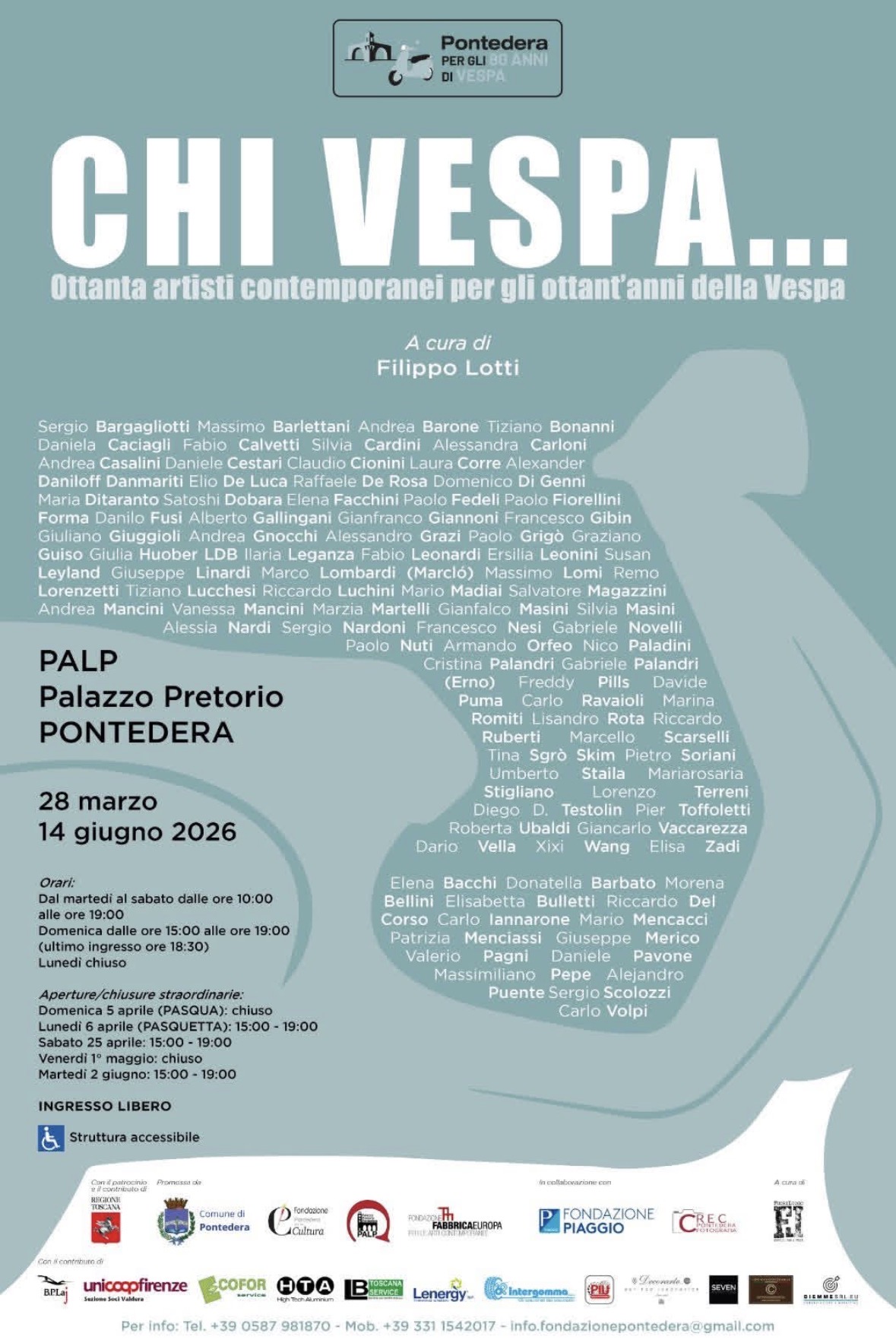 Chi Vespa …a Pontedera “Chi Vespa… Ottanta artisti contemporanei per gli ottant’anni della Vespa”, a cura di Filippo Lotti, in programma al Palp Palazzo Pretorio, dal 28 Marzo al 14 Giugno.
